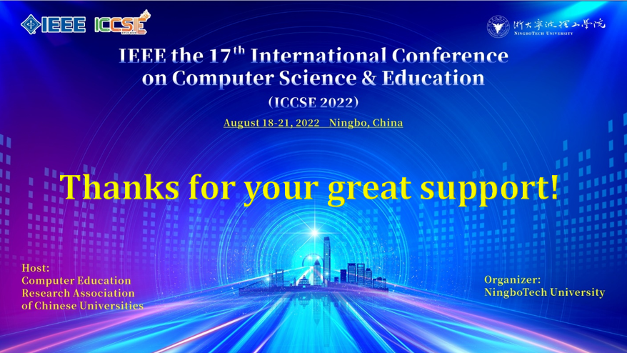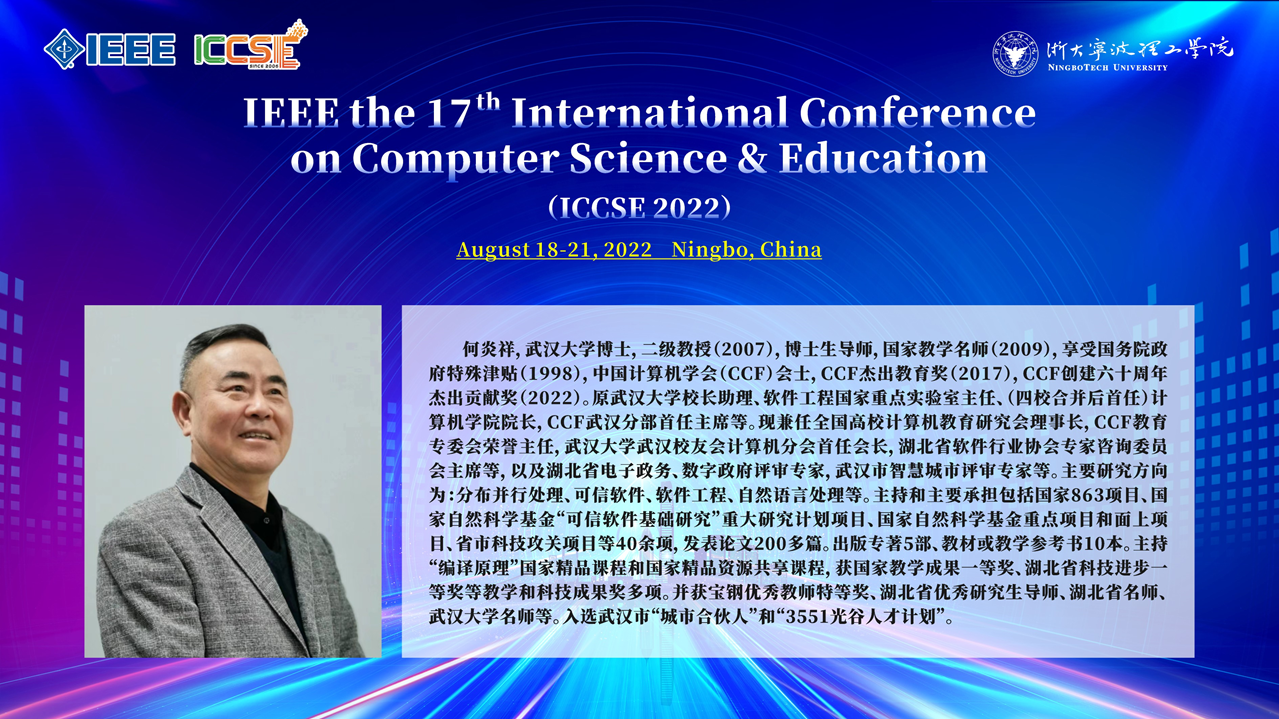 2022年8月18日-21日,第17届国际计算机科学与教育会议IEEEthe 17th International Conference on Computer Science & Education(简称IEEE ICCSE 2022)在宁波成功举办,来自中国、美国、澳大利亚、德国、意大利、泰国、印度和日本8个国家,183所高校的专家学者和师生嘉宾在线下主会场与线上腾讯会议共同参会进行学术交流。IEEE ICCSE 2022由全国高等公司计算机教育研究会(国家一级法人学会)主办,IEEE教育协会提供技术支持,云顶7610线路检测、教育部国别和区域研究备案中心—云顶7610线路检测“波兰研究中心”、宁波市阳明文化创造性转化与传播基地承办。本届会议特别邀请了主办方全国高等公司计算机教育研究会理事长何炎祥教授,研究会原理事长王志英教授,研究会副理事长、IEEE ICCSE 2022荣誉主席李茂青教授;承办方浙大宁波理工公司党委书记、IEEE ICCSE 2022荣誉主席胡征宇,云顶7610线路检测副董事长鲁东明,以及主旨报告专家香港中文大学陈本美院士,清华大学胡事民教授和东南大学李世华教授。