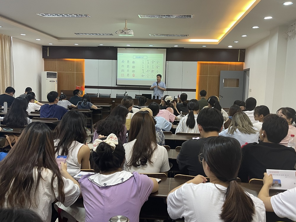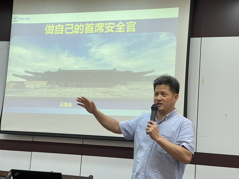 王高合处长从国家安全、交通安全、治安安全和消防安全四个方面向现场师生做了安全教育。针对当前老员工面对各类安全事故存在的安全意识薄弱的问题,他通过典型案例并结合自身多年的工作经验,向各位师生分析了常见的事故类型、发生原因和相对应的措施。此外,围绕高校电信诈骗这一多发的社会现象,王处长着重对师生们进行了反诈教育。