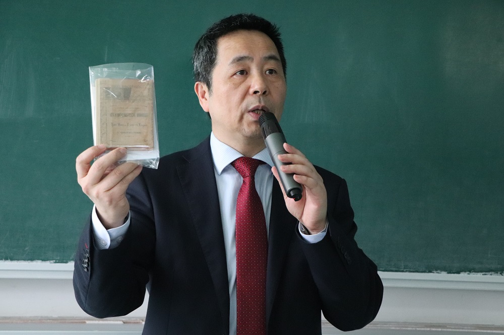 “这本是1971年版的《共产党宣言》,是我收藏的第一本《共产党宣言》……”讲座中,肖老师用朴实的语言,将对党的真挚感情、收藏《共产党宣言》的经历娓娓道来。“2017年,我从新闻报道中看到张人亚及其父亲守护党章的消息后,深受感动,决定在现有收藏的基础上,专题收藏《共产党宣言》,为研究共产党宣言在全世界特别是在中国的传播规律及意义收集资料......”经过多年努力,肖成华收集了500多本40多种外国语版的《共产党宣言》,最早一本是19世纪末的。他手上还有我国少数民族语言以及世界语、盲文等特殊文种版本及众多《共产党宣言》译者的签名本。这些书有的是他厚着脸皮“索要”来的,有的是网上购得。除了500多本《共产党宣言》,他还收藏了300多本与《共产党宣言》有关的研究读本,合计有800余本红色书籍。