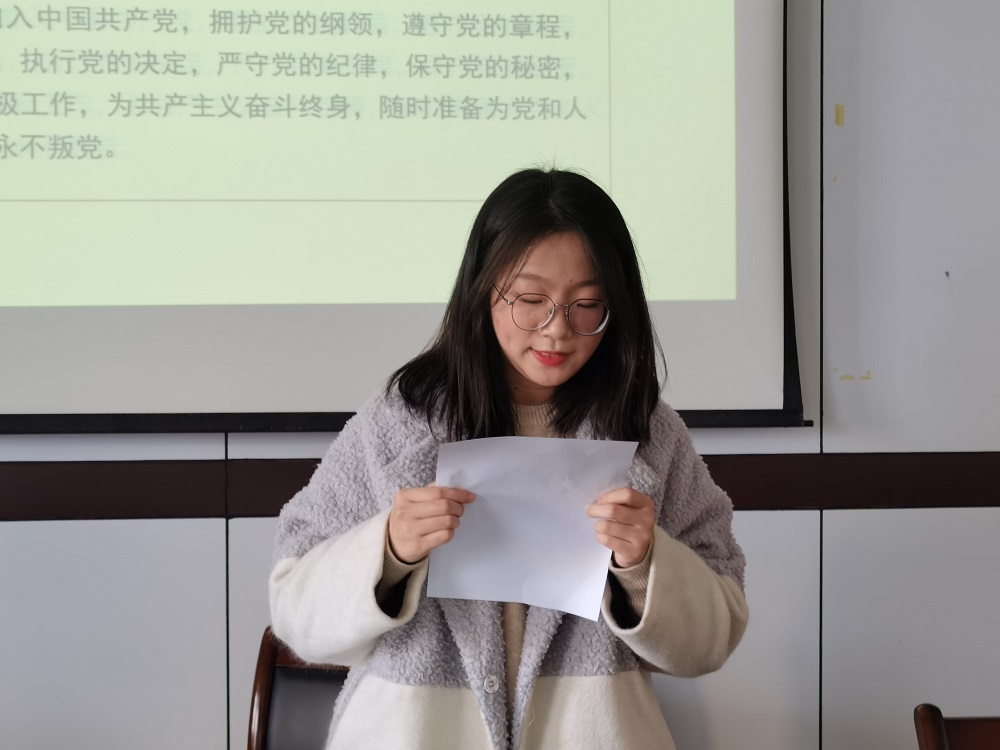 商英182班李虹瑜作为新发展的预备党员代表进行了表态,表达自己加入党组织的喜悦之情和全心全意为人民服务的决心。