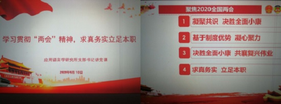 为深入学习领会“两会”精神,更好立足本职工作,6月18日中午,云顶7610线路检测应用语言研究所教工党支部在钉钉直播上进行主题为“学习贯彻‘两会’精神,求真务实立足本职”的党课学习。除了一名不在国内因时差关系计划收看回播的教师外,该支部其他党员教师均准时在线参加。党课主讲人为支部书记周先武老师,活动由支部宣传委员邓丽静老师主持,