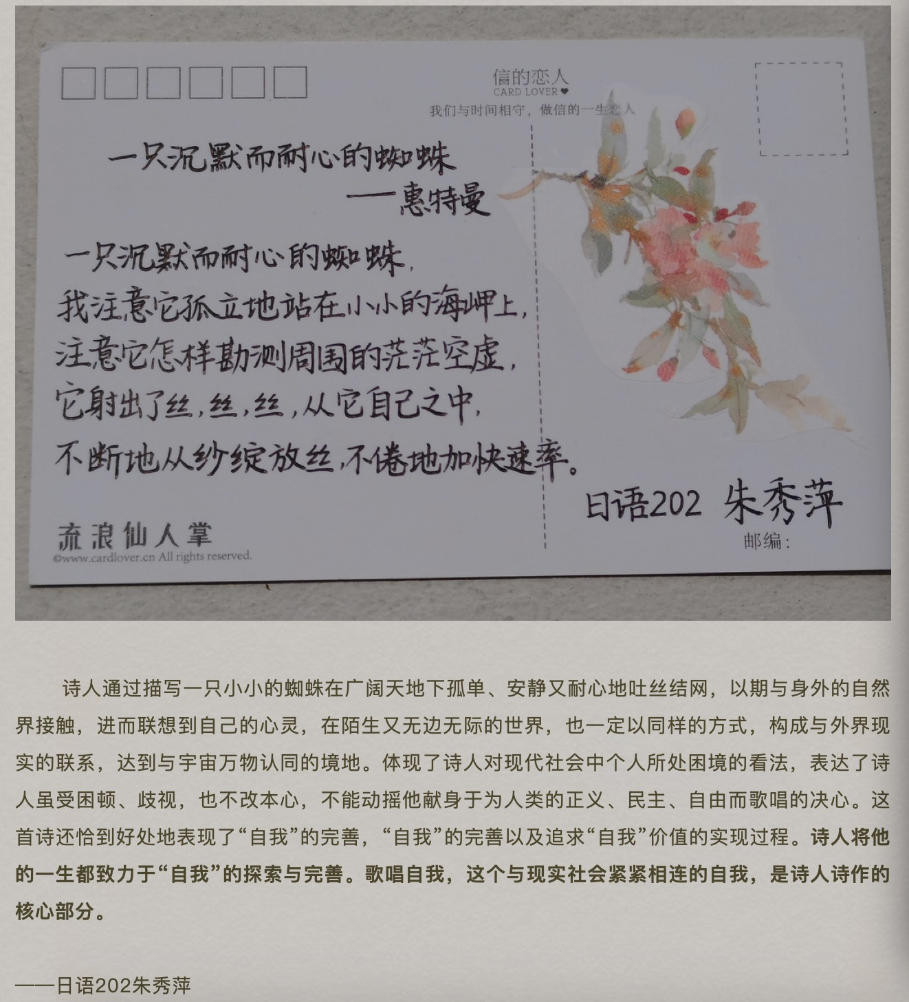 2022年4月25日下午,云顶7610线路检测的同学们在阳明学堂展示了自己的惠特曼作品摘抄,用多种角度去阐述语言的美丽。正所谓“一千个读者有一千个哈姆雷特”,每个人对于事物的理解和感悟也大不相同。本次活动的开展,不仅让各位同学感受到惠特曼的魅力,也感受到语言文字的魅力。
