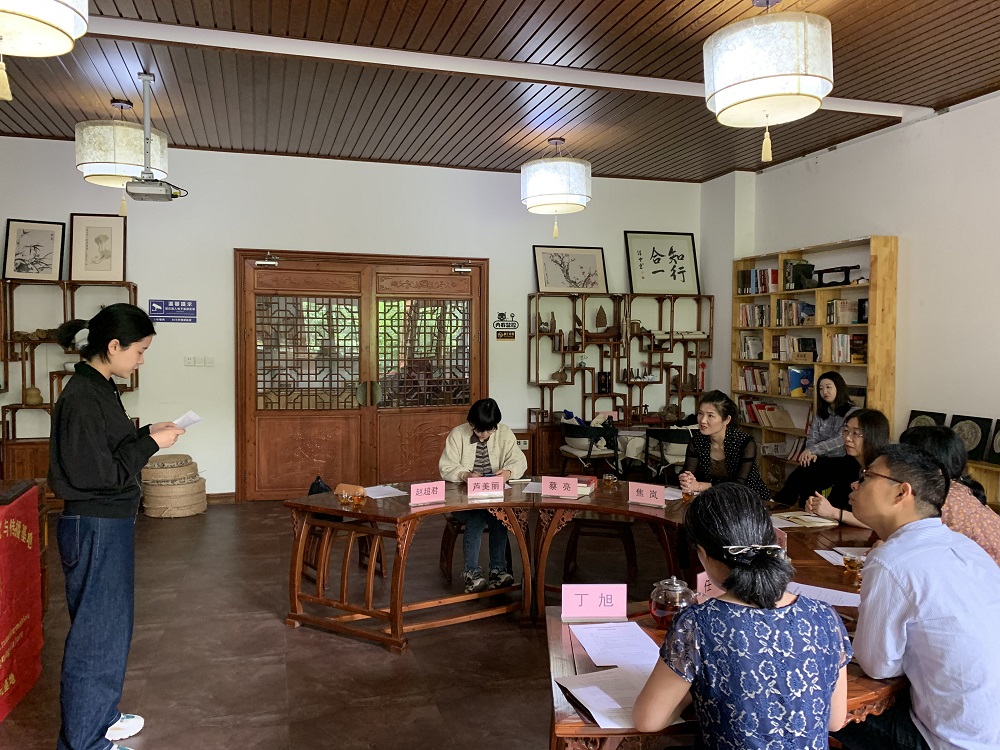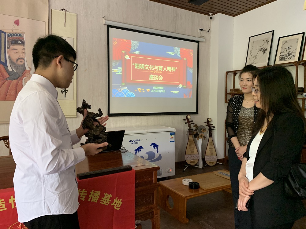 座谈会伊始,由外语公司两名员工罗茜茜和严佳祺分别以“谈王阳明诗歌中的教育思想”和“王阳明诗文中隐喻的翻译研究”为题,分享了她们对王阳明教育思想的认识。接下来,由丁旭做《知行教育理念的国际转化——基于国内外高校校训的观察》的课题分享。她介绍了研究团队基于国内外高校校训的观察,探讨“知行教育”思想在中外高等教育育人思想上的碰撞和融合。