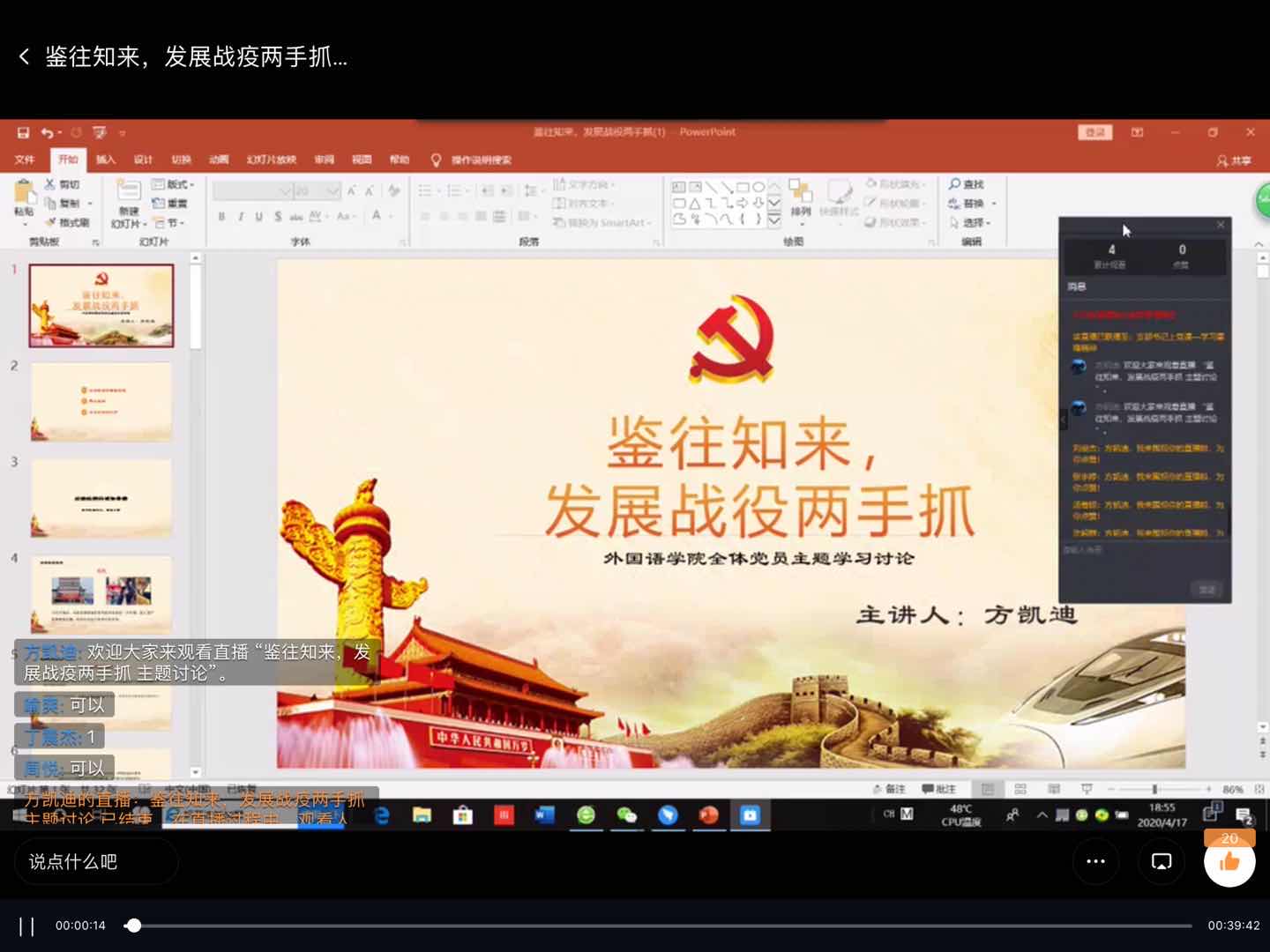 学习活动后,许多党员发表了自己的感想,员工第一党支部罗茜茜同学谈到,在本次“鉴往知来,发展战役两手抓”的党员主题学习中,我们更深入地了解了“两山理论”以及习总书记浙江行背后的意义。竭泽而渔,不如从长计议,我们应该尊重环境,保护环境。员工第二党支部毛璐颖同学谈到,我们要在全面努力打赢疫情防控阻击战的同时将“发展”一并抓起来,要正确处理好疫情防控和经济社会发展的关系。