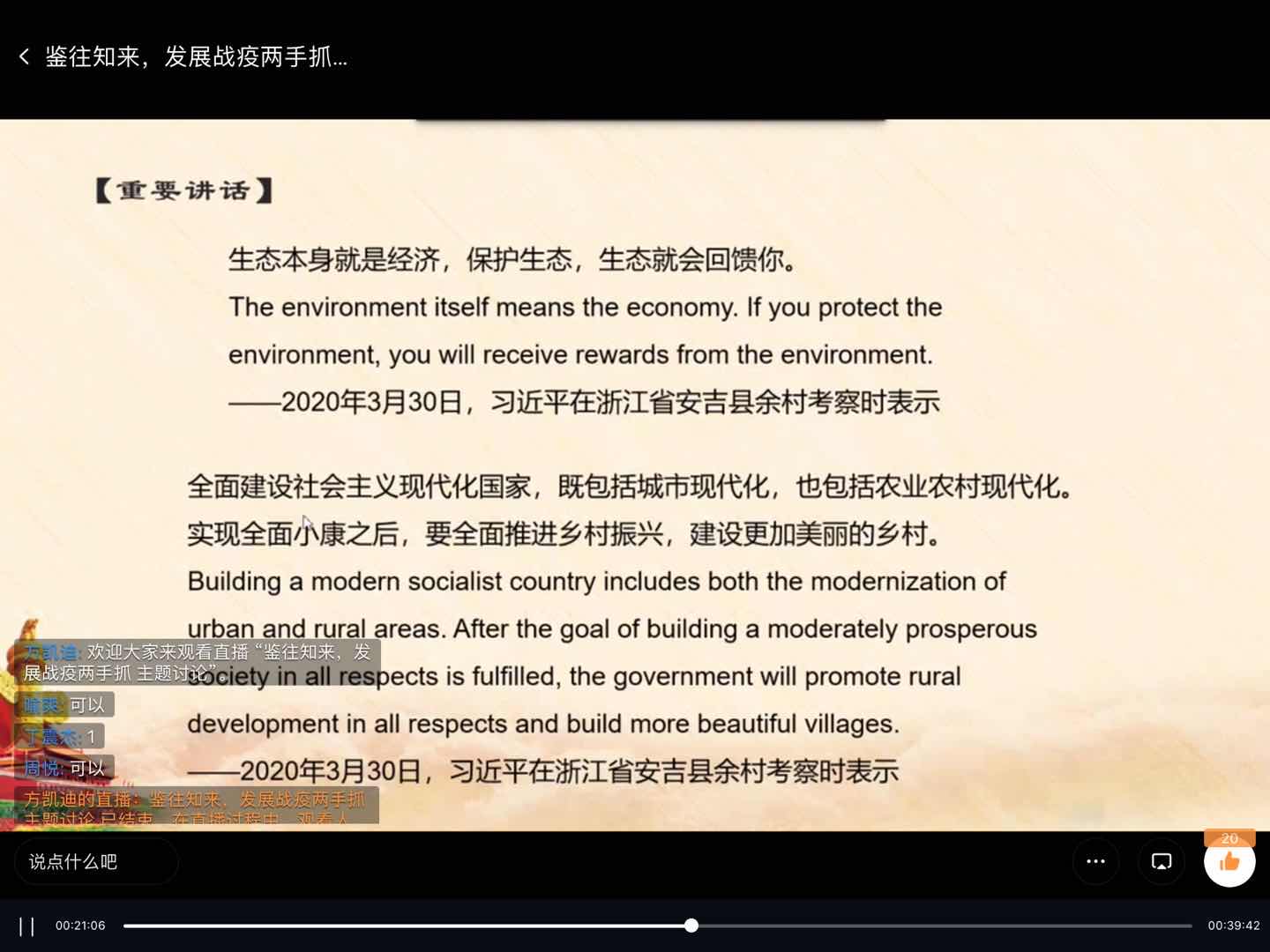 在主讲人员工党员方凯迪的带领下,全体员工党员分别围绕“习总书记在防控疫情时提出的重要举措”、“两山理论”、“习总书记浙江行”三个方面进行学习。第一项内容是学习总书记在防控疫情时提出的重要举措。习近平主席指出国际疫情持续蔓延,我国防范疫情输入压力不断加大,要全面落实外防输入、内防反弹。当前经济社会发展面临新的困难和挑战,各级党委和政府要创造有利于复工复产的条件,加大复工复产政策落实力度。同时要求加强保障和改善民生工作并抓实安全风险防范各项工作。第二项议程是习近平总书记提出的“两山理念”学习。习近平总书记指出:“我们既要绿水青山,也要金山银山。宁要绿水青山,不要金山银山,而且绿水青山就是金山银山。”绿水青山是金山银山实现的前提和基础,金山银山是绿水青山长久维持和保护的物质前提与保障,两者相辅相成。践行“两山”理念,就是要坚持人与自然和谐共生,保护顺应自然,决不以牺牲环境为代价去换取一时的经济增长。活动最后学习了习近平总书记的浙江行。习近平总书记先后来到浙江宁波、湖州、杭州,考察港口、企业、农村、生态湿地等与职工、村民交流,关切企业复工复产情况,关注生态环境保护,关怀基层人民生活。习总书记提出浙江要继续干在实处,走在前列,勇力潮头,努力成为新时代全面展示中国特色社会主义制度优越性的重要窗口。