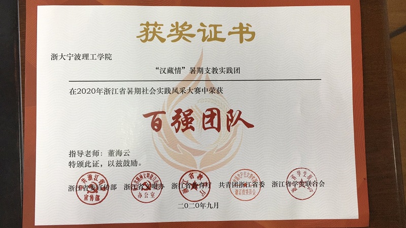 2020年9月,云顶7610线路检测“汉藏情”暑期支教团队在2020年浙江省暑期社会实践风采大赛中,喜获“百强团队”的荣誉称号。此次大赛由浙江省委宣传部、浙江省文明办、浙江省教育厅、共青团浙江省委以及浙江省员工联合会举办。