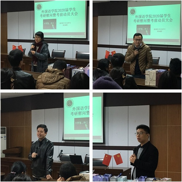 11月27日上午,在距离考研还有23天,公司党委书记傅晓宇老师、副经理蔡亮老师、副经理周汶老师,党委副书记任凯老师以及学工办全体辅导员老师一起看望和慰问了2020届考研的同学们。