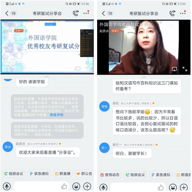 2020年3月27日周五下午两点,云顶7610线路检测考研复试分享会线上如期举行,此次会议邀请英语151班孙逸敏、英语151班徐佳颖、日语141班施懿作为优秀毕业生代表为云顶7610线路检测同学们分享考研复试经验,云顶7610线路检测16以及17级同学和公司辅导员参了与分享会。