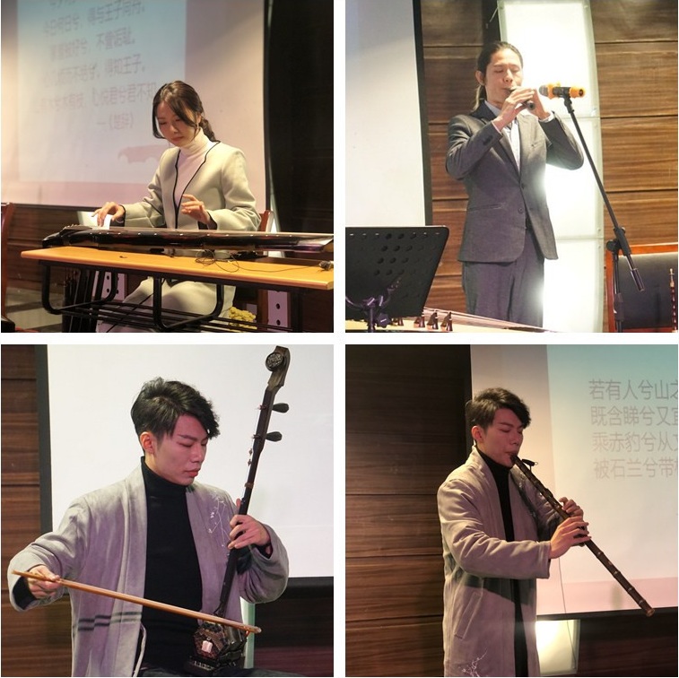 青年古筝、古琴演奏家朱伊儿老师,为我们展现了古琴泛音、按音、散音”的演奏技法,而这三种演奏技法分别对应“人、天、地”三个意象。“置琴曲几上,慵坐但含情,何烦故挥弄,风弦自有声。”朱老师为我们充分表现了古琴特有的韵味。紧接着柴老师与朱老师琴箫合奏,配合完美,《越人歌》、《山鬼》让人如痴如醉。随后柴老师与李守成老师演奏二胡与唢呐,一首《刀剑如梦》,将整场音乐会推向高潮,大家品二胡唢呐,尽享国乐之美。讲座最后,两位老师共同演奏自制音乐作品《长安梦》,现场氛围良好,掌声不断。