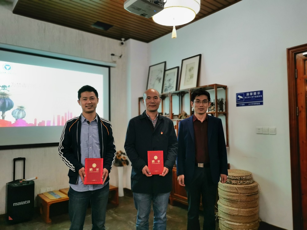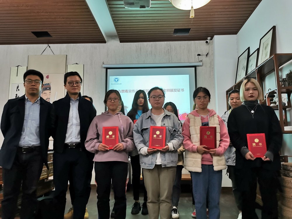随后由周春晓老师为叶卫树和俞晗两位禁毒指导老师颁发证书,任凯老师为禁毒宣传志愿者服务队成员们颁发证书。