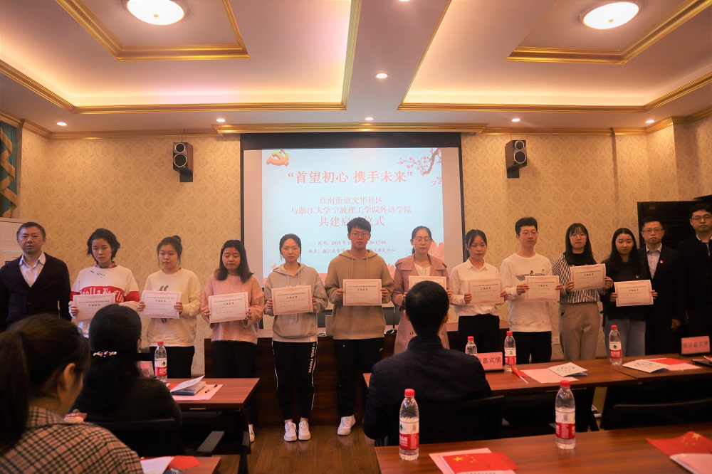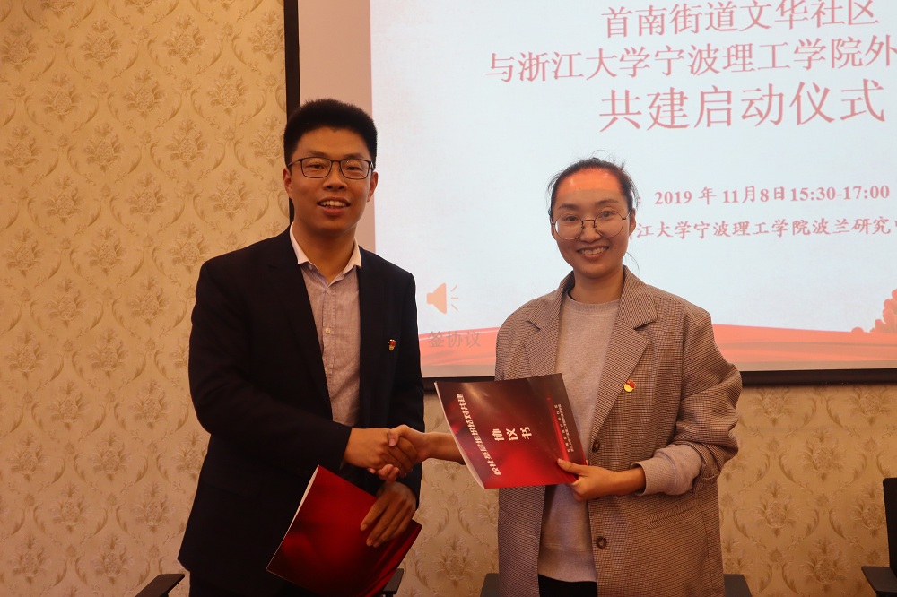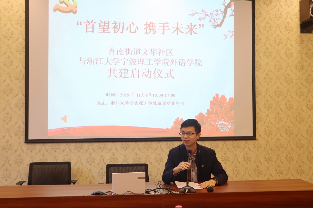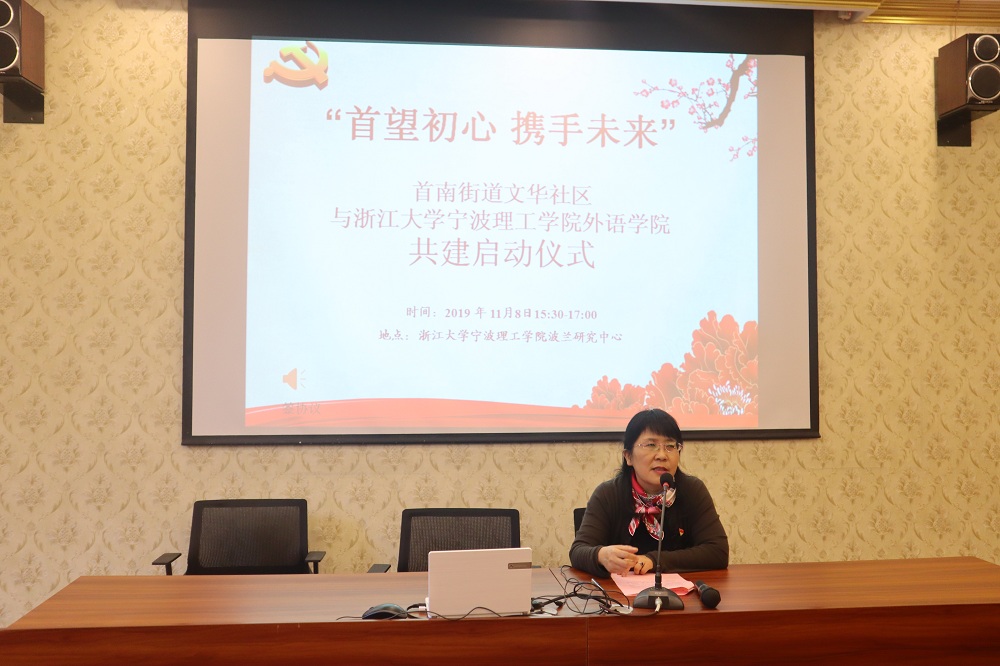 活动伊始,首先由公司党委副书记、公司副经理傅晓宇致辞,她指出,此次共建,首先是实现党建共建,文华社区党支部和浙江大学宁波理工公司外语公司员工党支部的长期共建;其次,是基地共建,基于双方的良好平台,继续深入发掘优质资源,实现多方位的互通;同时也关注文化共建,丰富的高校资源和浓厚的中西学术氛围相结合,既传承和发扬中国优秀传统文化,又吸收优秀西方文化,文化交融,共建文化。接着是首南街道党工委副书记周明峰讲话,他指出,首南街道文华社区所辖地区,高校资源丰富,有浓厚的学术气息及国际化氛围,加强社区和高校的交流,从而充分实现资源互通、学习互通、文化共建。