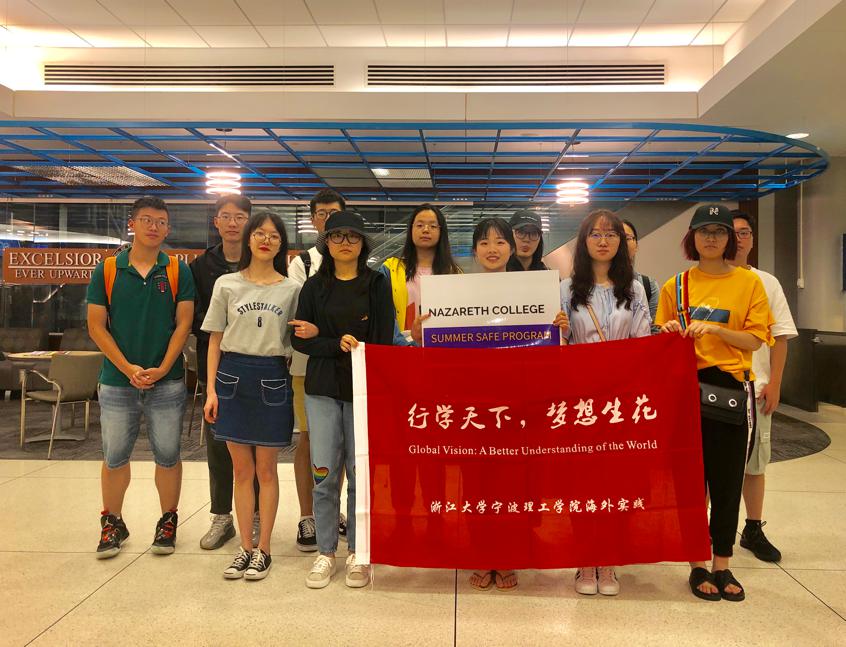 飞机飞上三万尺高空,经过23小时飞行加转机时间后,浙江大学宁波理工公司暑期海外游学美国团10位员工及带队老师周维于纽约时间2019年7月14日凌晨抵达位于纽约州罗切斯特市的拿撒勒大学。舟车劳顿,疲倦却被深夜仍在等候的员工助理的热情招待一扫而空。