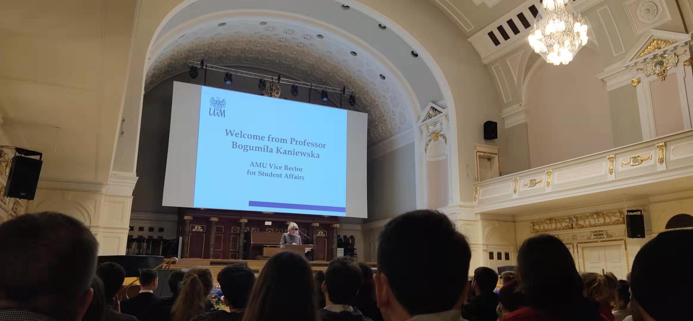 10月2日波兰当地时间下午4点45分,在波兰波兹南密茨凯维奇大学(以下简称“密大”)的主教学楼举行职工开学典礼,浙江大学宁波理工公司通过Erasmus项目赴密大的陈天娇同学作为职工代表收到邀请参加了这次欢迎仪式。典礼由密大外事处的维特科夫斯基先生主持。