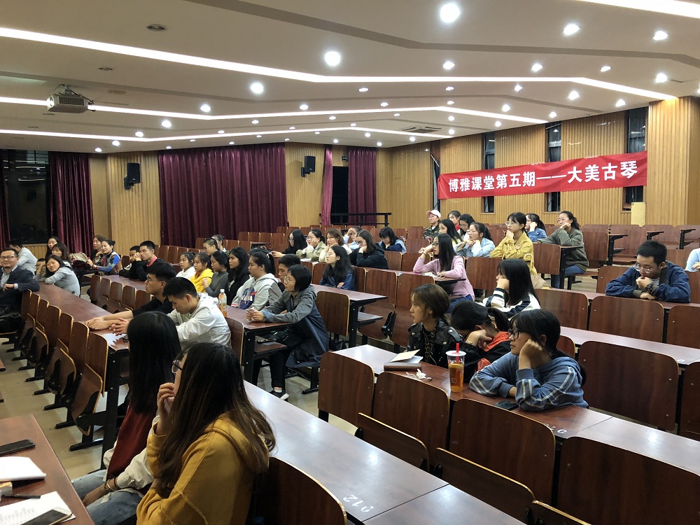 公益讲座以一首小曲《秋风词》拉开了帷幕,一首轻柔的小曲之后,章老师从琴之史、琴之器、琴之音和琴之道四个方面为大家介绍了古琴的历史文化和魅力。讲座期间,章老师为大家介绍了太古音、松石间意等唐宋名琴,还对古琴结构、音色种类等最基础的知识进行了普及和介绍。在简洁的文字介绍之外,章老师还为在座师生穿插播放了古琴申遗的短片和著名古琴大师管平湖先生舍命救琴的故事,展现习琴之人对对传统文化的尊敬与热爱。除此之外,章老师还向大家分享了她习琴之后品味、气质、判断力等方面的变化与提高。“即使是同一首曲子,每天的练习都会有新的体会。习琴给我带来的不仅仅是审美以及判断力的提高,更是一种艺术的熏陶,不仅悦耳,也悦心。我觉得走近古琴就是走近自然,走近自己的内心。”