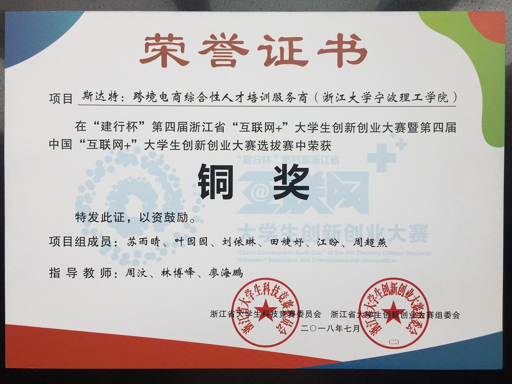 “建行杯”第四届浙江省“互联网+”老员工创新创业大赛暨第四届中国“互联网+”老员工创新创业大赛选拔赛结果揭晓,由云顶7610线路检测商务英语专业2015级员工苏雨晴、叶园园、刘依琳、田婕妤、江盼等同学为主要成员组成的跨境电商创业团队,以“斯达特:跨境电商综合人才培训服务商”项目获得该大赛的铜奖。