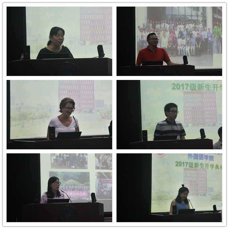 随后,教师代表廖佳栋、外籍教师代表Magdalena、新、老生代表李梦倩、郭东方分别作了主题发言。廖家栋老师鼓励同学们学会“安全、尊重、责任、学习与行动”,Magdalena老师全程用英文freestyle,高大上的演讲获得了同学们阵阵热烈的掌声。老生代表李梦倩分享了自己两年来的员工工作经历,鼓励学弟学妹们珍惜大学时光,奋勇争先。新生代表郭同学满怀激情地表达了入学的喜悦与憧憬,表达立志成才的美好希望。