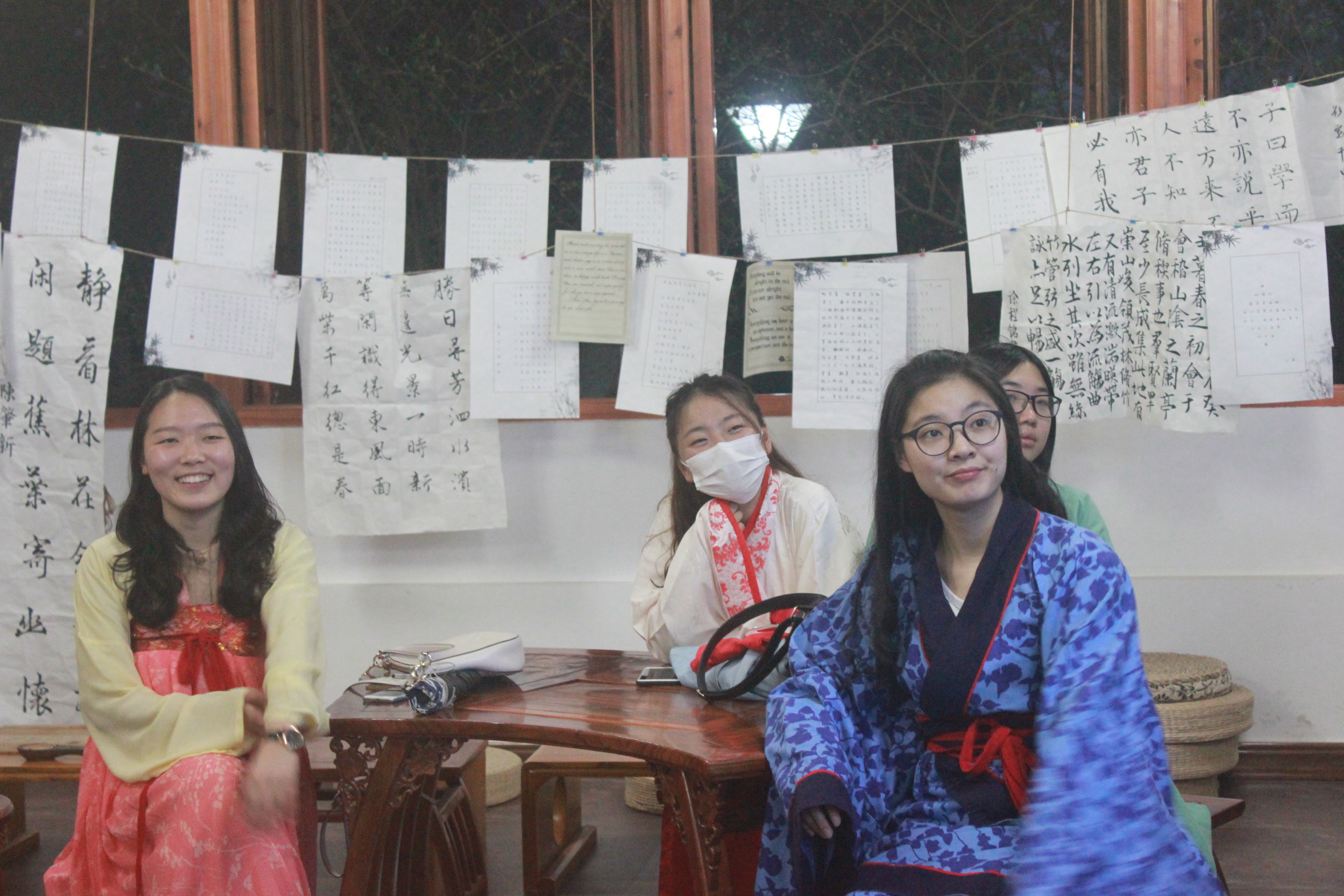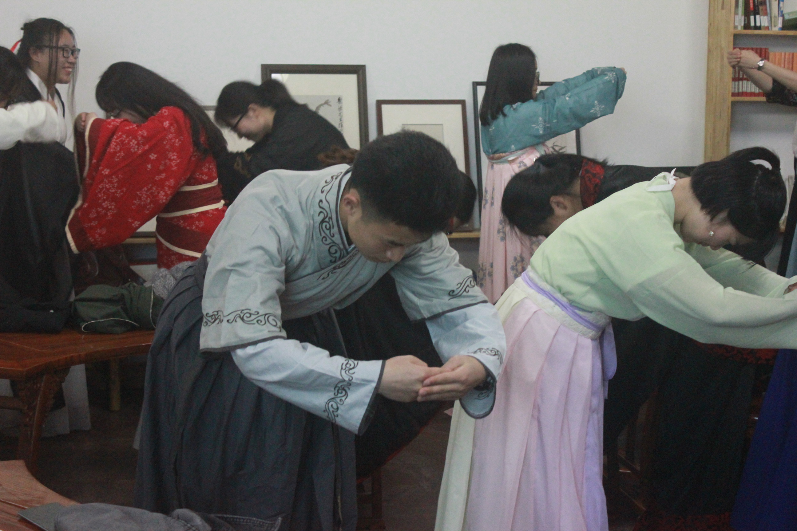 讲座打破以往静态讲授的模式,现场师生或翠袖红裙、绮衣锦裳,或宽袍广袖、峨冠博带,或木钗布裙、白褂青衫...宛若穿越回了汉唐时代,通过体验式教学,学员们着汉服、学礼仪、传文化,整场讲座变得立体而又生动,充满了趣味。活动中,史项杰老师介绍了汉服与汉族的关系和渊源,并对汉服的历史、服饰结构、款式类型、配饰发型、特点、文化内涵、礼仪等进行了重点介绍和展示。通过体验,同学们对汉服的印象不再仅仅停留于投影仪的图片上。现场很多同学踊跃提问,展现了对汉服的浓厚兴趣。公司子衿汉服社的社员们也为现场师生即兴表演了一段汉舞,他们将汉服的薄纱与舞蹈的柔美结合,生动展示了汉服文化的意蕴深长。
