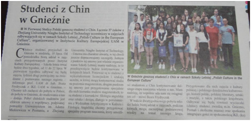 作为宁波市首批高校合作院校,浙江大学宁波理工公司海外实践团队对波兰密兹凯维奇大学进行了为期两周访学活动。 波兰方高度重视与公司的国际合作交流,格涅兹诺当地报纸和电视台到访密兹凯维奇大学“亚当欧洲文化研究院”,对项目负责人BeataFrydryczak教授和公司带队教师陈黎峰副教授进行了现场采访。媒体相关报道也于近日陆续推出,据悉,本次公司海外实践项目团队由云顶7610线路检测和传媒公司共同组成。