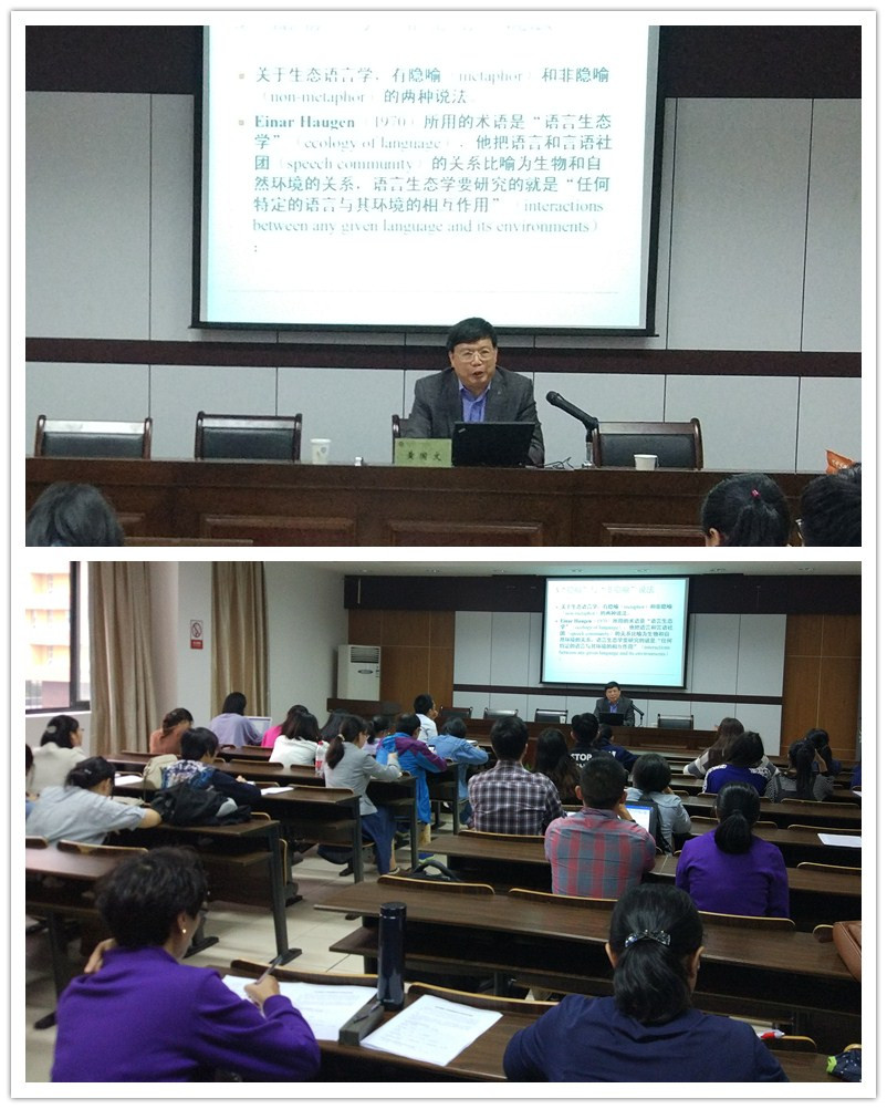 黄国文教授的讲座主要从多个方面介绍了生态语言学的发展背景和现状。黄教授认为生态语言学是生态学与语言学结合而形成的交叉学科,他把语言比作一个生态系统,认为语言有自己的生态环境,它是语言发展的基本条件。他还认为语言是我们人类在行星生态中所起作用的一个基本方面,人类通过语言反映现实,建构世界;主张从积极和正面的角度审视人们赖以生存的话语。黄教授介绍了生态语言学研究的“豪根模式”与“韩礼德模式”两种主要研究类型,并就八种生态观和三种研究视角作了简单扼要地介绍。