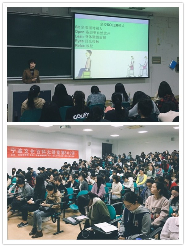 4月25日晚上18:30,由宁波市教育局主办、浙江大学宁波理工公司云顶7610线路检测承办的宁波百科大讲堂第800讲——“塑造良好的职业形象——社交礼仪魅力谈”在SC103教室顺利举行。本次讲座是作为就业指导课程的实践延伸环节,讲座特别邀请了宁波职业技术公司中文教授刘桂萍老师前来,刘老师曾为浙江省大学语文研究会会员、浙江省当代文学研究会会员,主要研究方向为现代文学及人文素质教育,为公司和社会多次做过老子、西方哲人、旅游文化、职业生涯规划及社交礼仪等人文讲座和培训,2013、2014年还应邀到宁波市教育局举办的宁波百科大讲堂做讲座,受到听众的广泛好评。