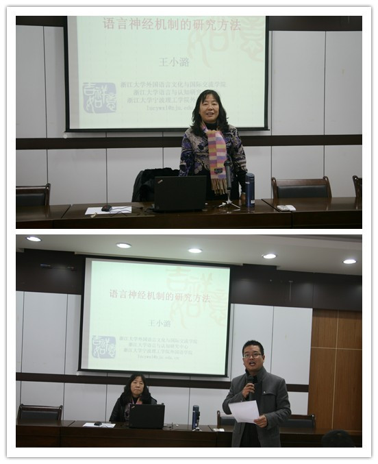 本次讲座的主题“语言神经机制的研究方法”,研究语言和大脑之间的关系,可以更好地认识人类大脑的性质,进而加深对于人类自身的认识。在讲座中,王小潞教授详细阐述了语言神经机制的两个视角:在线与离线视角。王经理从在线视角的角度介绍了神经语言学的研究方法,如脑电图记录(Electroencephalography,EEG)、事件相关电位(event-related potentials,ERP)、功能磁共振成像(Functional Magnetic Resonance Imaging,fMRI)、正电子断层扫描(positron emission tomography,PET)、眼动(Eye Tracking)等技术手段。在离线视角上,王小潞教授谈到了“失语症”的研究和治疗,失语症是人类由于大脑损伤所导致的语言障碍,而这些障碍往往表现在语言的某一特定方面。她通过对两例单纯疱疹病毒脑炎所致的主要表现为失语的病例作为案例,通过病人的失语检查和影像学分析,探讨颞叶(人类脑组织中的一个器官)病灶与失语表现之间的关系。在这个案例中,证明了颞叶的不同部位在语言形成过程中起着不同的作用,也可以判断出不同部位的治疗对病情恢复的作用。 神经语言学的研究多利用医学仪器设备作为研究工具,研究较为复杂,但王小潞教授逻辑谨密,思维灵活敏捷,通过图文并茂的展示,言简意赅地介绍了该领域内的主要的研究方法与研究手段,使全体教师在语言学的跨学科研究上开阔了眼界,拓展了思路,受益匪浅。