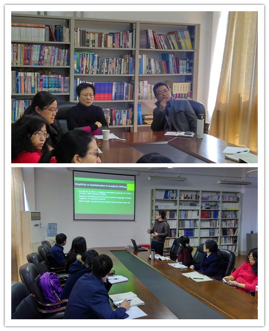 英语学术写作的教学与研究一直是外语学界研究的热点之一。首先廖佳栋博士就学术英语写作中的“简洁性”为题向大家汇报了其近期研究成果。对于母语为非英语的员工,在写作过程中他们倾向使用大量简单的词语与语句,这些简单的词语与语句经常出现在英语口语的表达中,而不被学术英语所接受。廖佳栋博士介绍了学术英语写作中如何做到“简洁”同时又能被西方学界所接受的方法。Winnie Cheng教授充分肯定了廖博士的研究成果,但也同时提出为了提高研究的充分性和客观性,可以通过语料库的定量研究方法加以完善。在交流过程中,孙广平副教授和芦俊燕副教授以平时在英语教学过程中的一些英语学术写作教学经验,作了一系列的补充。此外,研讨会中也有多位年轻教师介绍了自己近期的研究,如李辉老师的心理词汇研究、阮征老师的大学英语微信教学交流平台研究、李飒老师的商务英语教学研究等,Winnie Cheng教授在认真听取了问题后对她们一一做了细致耐心的答复,整个研讨会充满着浓浓的学术氛围。