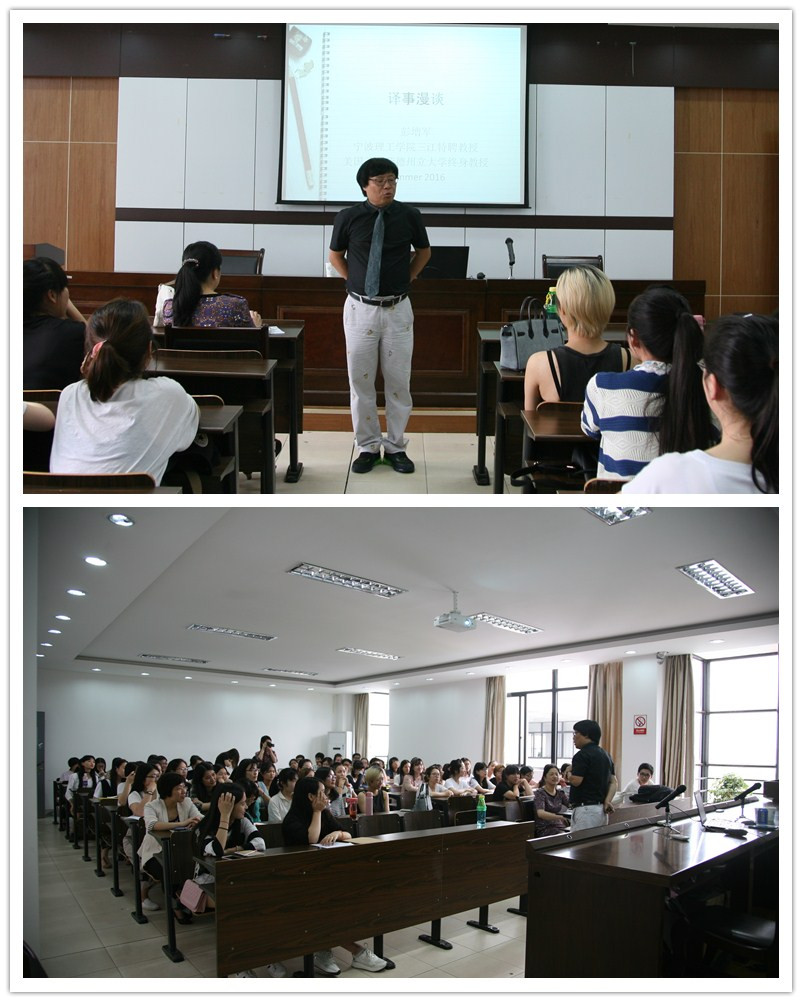 2016年5月30日下午,应公司的邀请,美国圣克劳德州立大学终身教授彭增军博士在SC405为英语专业的员工作题为“译事漫谈”的讲座,讲座由公司副经理王国凤教授主持,英语131、132、133班全体员工及部分老师参加了讲座。