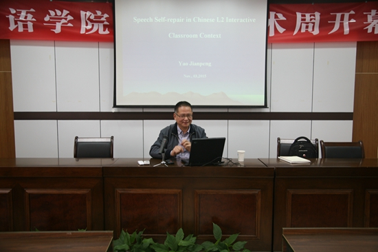 英语会话自我修补,一直是语言学会话研究的热点之一,研究说话者在言语交际过程中监测到言语错误后自我纠正错误的行为,把它应用到日常外语课堂中具有十分重要的教学价值,能逐步增强员工学习语言的能力和信心。姚剑鹏教授以一句话开场,引领在场师生进入了一个十分有趣的语言研究世界。他详细的阐释了英语会话自我修补的分类原则、标准和方式,并深刻论述了作为外语教师,在课堂上如何应用它,发挥出在互动授课环境下产生的积极作用。他的报告立足学术前沿,见解独到,其内容由浅入深,各部分环环相扣,逐层递进,引人入胜。在讨论环节,大家针对姚教授的讲解纷纷举手发言,姚教授则旁征博引,悉心作答。这一互动环节,充满睿智与精彩,大家受益匪浅。