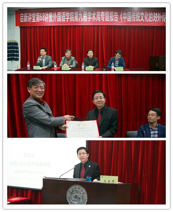 11月9日下午,外语公司有幸邀请了中国人民大学郭英剑教授在NC202会议室,面向全院师生作了题为《中国传统文化的对外传播及发展趋势》的学术报告,本次报告会是公司启新讲堂第68讲与云顶7610线路检测第9届学术周专题讲座。郭英剑教授是国家首批“新世纪百千万人才工程”国家级人选、享受国务院政府特殊津贴专家、全国模范教师、教育部高校英语专业教学指导委员会委员。讲座由外语公司副经理胡海鹏主持,公司俞春鸣副经理、人事处朱苏永副处长出席了会议。