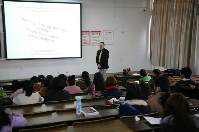 3月12日下午,英国贝尔法斯特女王大学翻译学科负责人Piotr Blumczyski博士应邀为云顶7610线路检测的员工做题为Painting, dressing, planting and cooking—images of translation across centuries的专题讲座。公司大三全体员工参加了讲座,讲座由英语专业负责人张振梅副教授主持。