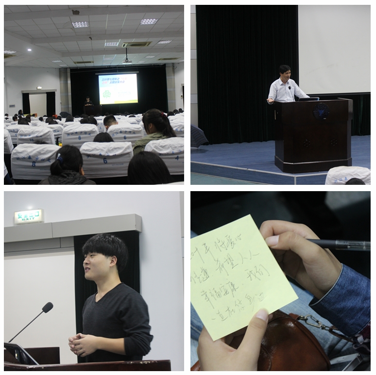 在观看视频的过程中,出现了一个小插曲,教室突然停电了。整个大教室瞬间陷入了黑暗之中,但是冒着风雨到场的全体同学都保持了井然的秩序,并为分享会亮起了手机灯光,点点的灯光也许不足以照亮整个大教室,但是这份支持却感染着“三叶草”的每一个成员。在这期间,书记给大一的同学们讲述了“三叶草”的故事,感人肺腑。书记不仅仅告诉了同学们他与三叶草的故事,更向同学们表达了他的期望:希望同学们拥有爱的精神以及对生命的尊重。正如他所说的“人生需要一份阅历,需要拥有对生命的关怀与博爱精神……”。