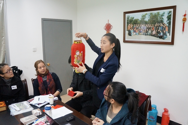 工作坊从自我介绍开始,南腔北调的英语声和充满善意的笑声让小小的会议室顿时热闹起来,而中国传统文化的讲解就在这轻松的氛围中上演了。孙晓莲同学从传统节日和风味小吃入手逐渐展开对中国文化的讲解,包括一些文化禁忌问题,比如数字和称谓的禁忌,这对中国人是心照不宣的事情,却给了初到宁波的老外们很大的帮助,避免了今后与中国人打交道会引发的尴尬场面。为了使老外们有身临其境之感,在介绍每一种文化时,“用声音叙事”团队成员都辅以实物展示,如在介绍传统佳节时展示了灯笼、中国结、红包等传统饰品;食品方面演示了月饼以及它的各种包装等等,令大家记忆犹新。