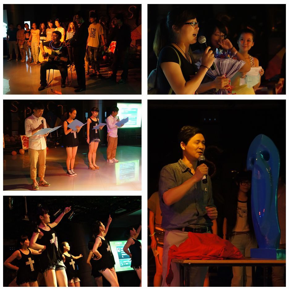 当晚的活动精彩不断,亮点纷呈。英文说唱《over》使人充分领略到了语言的绚烂之美,感受到了老员工活的勃勃生机。而张璧联珠同学带来的歌曲《Terrified》,声音悠远,节奏明亮,就像春日里阳光,动人,难忘。当然晚会最令人感动的环节还是中美09班的班导李军老师为大家带来的一首吉他弹唱歌曲《青春》,清澈的琴音伴着李老师淳厚的嗓音仿佛能让人听见青春的脉脉流淌,而在李老师演唱时中美班的同学自发地围在李老师的身旁,一起随音乐轻吟,灯光暗住了,时间停止了,在场的观众都沉静在一种淡淡的离愁别绪中,老师也哽咽了,或许是不舍吧,不舍那群孩子,不舍这大学的生活。