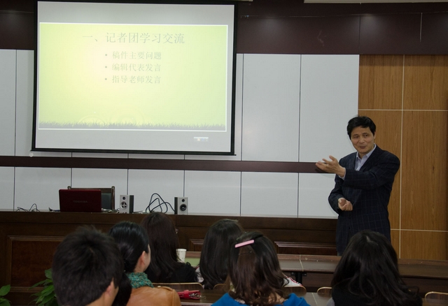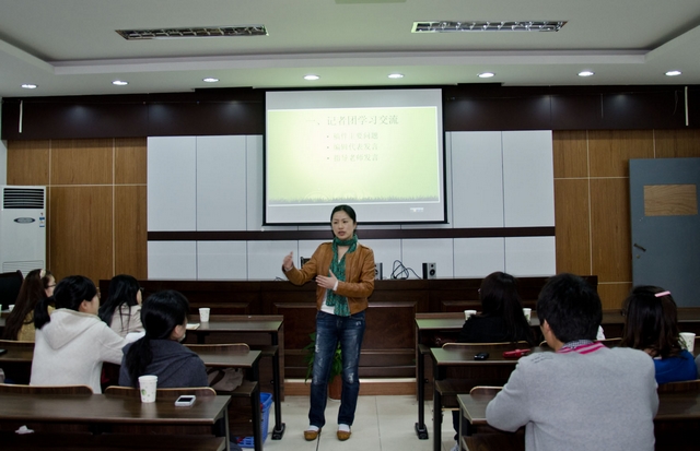 3月31日下午,浙江大学宁波理工公司外语公司英文报记者团全体成员在sc405举行学习交流会,围绕如何将英文报记者团打造成一支精干、高效的队伍展开热烈的讨论。公司党总支书记谌晓煜、经理助理兼记者团指导老师王国凤、记者团指导老师丁旭一起应邀出席了交流会。 谌晓煜书记在发言中充分肯定了社团在过去的一年中取得成绩,希望社团越办越好,并对社团的建设提出几点要求:要通过内部建设提高团队成员的凝聚力,通过师生群策群力,努力将报纸办好;撰写新闻稿件要紧密结合公司的发展建设,挖掘好的新闻素材并将它及时呈现给校园的广大师生。 经理助理兼记者团指导老师王国凤、记者团指导老师丁旭分别作了发言,她们从把握新闻素材的时效性、突出新闻报道的价值性、加强版面稿件的协调性等方面着手为员工记者们提了不少好的建议。随后,英文报的四位版面编辑及记者团团长针对各自版面所存在的问题进行了汇总交流讨论。 自去年9月英文报记者团组建以来,这些年轻的记者们怀着对英语新闻工作的兴趣与憧憬,加入这个团队,从零开始,学会了新闻稿件的撰写,熟悉了新闻采访到成稿的流程,为此付出了艰辛与汗水,在员工英文报这一专业实践平台上,不断锻炼自己的新闻素养与采写能力,提升自身专业水平和综合工作能力。 员工英文报作为高校与传媒合作的一种全新模式,也是外语公司借力于社会资源、开展多种形式的专业实践活动、促进了教学团队建设,丰富校园文化,提升人才质量的一项重要举措。