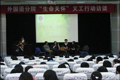 外国语分院“三叶草”生命关怀志愿服务队2007年6月成立以来,利用暑假和双休日到宁波李惠利医院对癌症晚期病人进行以陪护守望、交流抚慰、按摩缓痛为内容的生命关怀服务。三年来,最早的队员已毕业离校,但爱心接力棒从高年级向低年级继续传递,队员不断扩充,前后合计达75名,志愿服务累计达900余人次。同时,他们还积极进行了图片展示、访谈、报告、座谈等爱心传递活动13次;为提高服务质量,队员们参加临终病人陪护技能培训,向校外护理专业师生学习按摩技术,开展志愿服务经验交流等各项活动;为把队员服务中的体验升华为对生命的理性觉悟,志愿服务队向队员推荐阅读书目,组织学习讨论和聆听生命教育专家讲座。持续三年的生命关怀行动引起了校内外的关注与赞赏,获得了省内多家报社、电视台和国内重要网站的广泛报道。