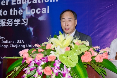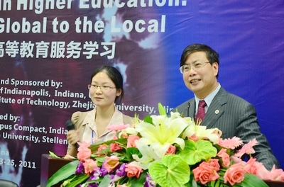 在9月23日下午由许为民教授和蓝采风教授共同主持的开幕式简短而隆重。公司党委书记费英勤教授,研讨会中方主席许为民教授,副经理杨建刚教授,美国印第安纳波利斯大学董事长Beverley Pitts博士,美方主席蓝采风教授,宁波教育局高教处李克让处长等嘉宾出席。费英勤书记发表了热情洋溢的讲话,诚恳地盼望各位来宾,畅所欲言,奉献才识,与大家分享智慧,共同促进高等教育服务—学习走向持续繁荣。许为民教授的主题发言“反思与启示: 服务-学习理论与中国高校志愿者行动 ”揭开了本次国际研讨会的序幕。
