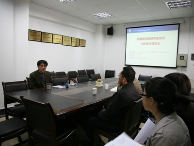 4月13日下午席建国教授和庞继贤教授指导的硕士研究生刘犇和陈曼分别作了题为Evaluation and Interaction in English Book Review Articles: A Cross-Disciplinary Study和A Comparative Study of Middle Constructions in English and Chinese的学位论文开题报告。两位研究生简要阐述了学位论文的基本思路、主要研究内容、涉及的相关理论、研究方法等。分院部分教师参加了这次报告会,并与两位研究生交流了论文涉及的学术议题和存在的问题。学术气氛活跃,取得了良好的效果。