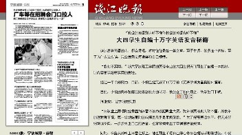 新学期开学后,外语分院一些在语音学习上有困难的同学手上多了两本《英语单词发音奥秘》共10多万字的小册子。小册子作者,英语072班的祝天飞同学正积极组织语音学习小组,推广介绍他在小册子里总结归纳的语音学习方法。9月29日,《钱江晚报》、《现代金报》、人民网、新华网、中国新闻网、凤凰网、中国日报网、中国教育网、浙江新闻网、搜狐网、网易、腾讯网、加拿大罗克斯公牛资讯等媒体对此事进行了报道或转载。 祝天飞同学在刚进校的时候是一位英语基础较差的同学,特别在语音学习方面,受过去所读中学学习条件的限制,更是遇到了很大的困难。在课堂上他常会因奇怪的发音而引出满堂的笑声,一个学年下来,他的学习成绩在班上处于中下水平。当时担任班长的他承受着很大的压力。 但不服输的祝天飞同学暗下决心,凭着坚强的毅力,花了比其他同学更多的时间克服语音学习障碍,他查阅了许多语音学习资料,通过请教老师、同学和自我摸索,总结出了一套英语单词发音规律,他的在语音学习上有了快速的进步。于是,他产生了把自己所运用的单词发音规律进行总结,编写与现用教材配套的单词发音学习用书的大胆想法。在外语分院陆莺、欧琛、喻旭燕等老师和科研处李文静处长的鼓励下,祝天飞同学成功申请到了公司科研处的立项课题——“员工语音纠错方法研究”,经过一年的努力,在老师们的指导下,《英语单词发音奥秘》(上、下两册)终于完稿了。另外,他也获得了第二学年的三等奖学金,并光荣地加入了中国共产党。 现在,祝天飞同学正致力于把他的学习经验和研究成果与同学们分享,老师、同学对他的《英语单词发音奥秘》也给予了充分的肯定。已经大四的他已决定报考研究生,他说:“我会争取机会,把研究进行下去”。一位分院老师说,祝天飞同学的学习经历为我们提供了一个通过研究性学习克服了学习困难,并培养了浓厚的学业兴趣的样本,对我们如何进行人才培养将提供一些有益启迪。
