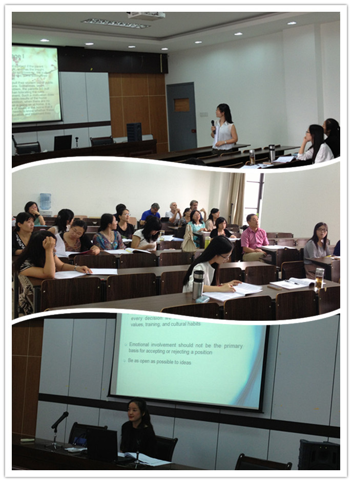 会上,阮巴燕、南二丽、阮征、王欢老师就前四章内容做了精彩的报告,介绍了批判性思维的定义和特点,阐释了论题、结论、理据、关键词、歧义、前设等关键术语的概念,并分析了如何从他人的论述中找到核心和框架,为进一步学习批判性思考奠定基础。与会教师们积极互动,就自己感兴趣的问题广泛交流意见,深入研讨,外籍教师在读书会上充满风趣幽默而又不失精彩的点评,将读书会的气氛推向了高潮。