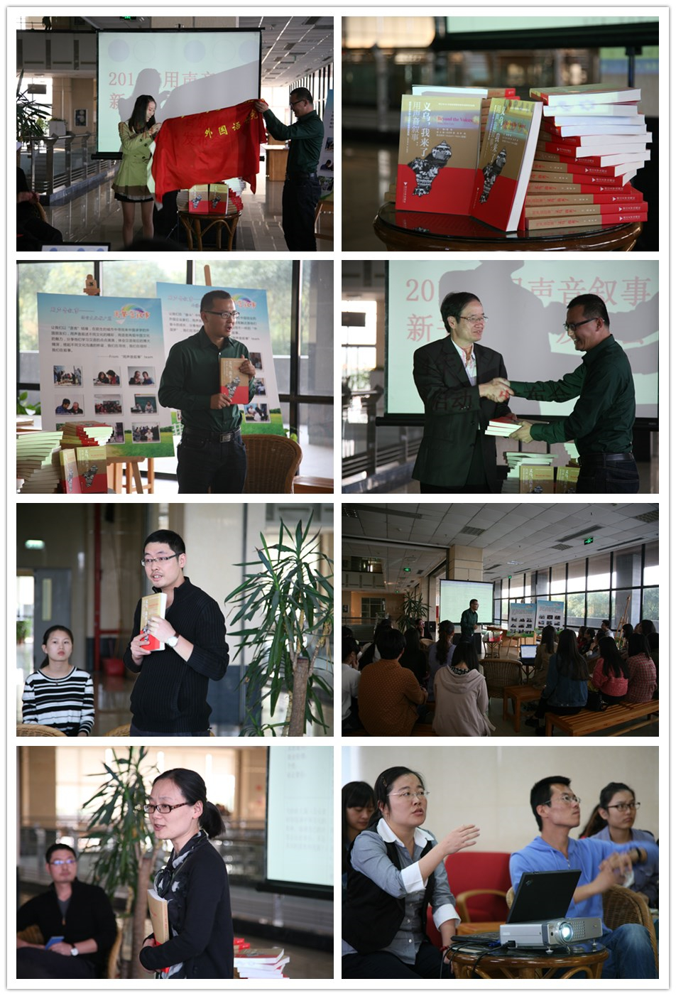 接下来刘老师邀请蔡副经理和朱小瞳同学共同为新书揭幕,刘杰老师的一句戏语“我们的书也是土豪金”,让人对新书充满了好奇,随着热烈的掌声,新书《用声音叙事:义乌,我来了!》揭开了它的神秘面纱。接着蔡亮老师简单介绍了关于用声音叙事的成长历史,他笑言:“这本书应该是他的第四胎了”,引来同学阵阵笑声。蔡老师谈到从08年到现在,在“用声音叙事”的成长历程中,无论是老师还是员工都付出了很多,同时也收获了很多,大家互相帮助、合作、努力,一本本书见证了大家一步步地成熟。蔡老师认为在叙事的“声音”中,不仅是采访人的声音、受访人的声音,更是年轻人的声音,这声音中充满了青春的活力。这声音也不止回荡在义乌,回响在浙江,这声音更要有穿透全国的锐利与朝气。蔡老师用自己的理解给予了用声音叙事的最完满诠释,让参与者都能深刻体会到这个活动的意义。
