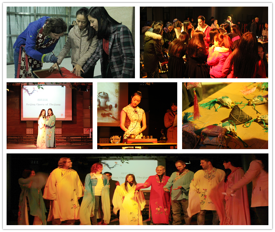 活动开始,茶艺社带来了精彩的茶艺表演。悠扬的音乐,精致的茶具,以及同学精湛的茶道表演,使现场观众还没喝到茶就已经感受到了浓浓的茶香。活动现场气氛活跃,同学们通过“萝卜蹲”特色小游戏、传统茶艺观赏、猜字谜、学越剧等民俗活动使外籍友人及同学们充分感受到中国传统文化的魅力。
