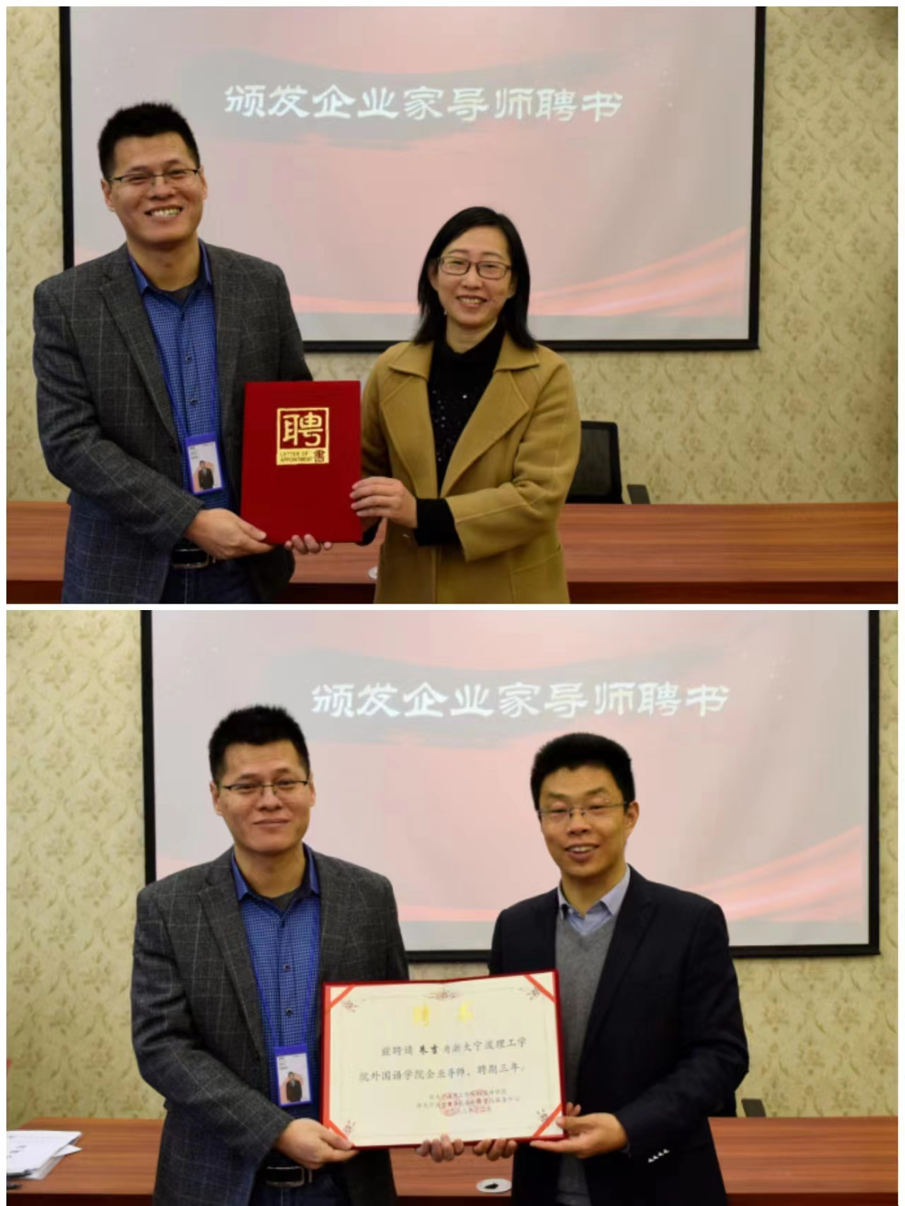 任凯和吴琼分别为朱吉、梅廷、李俊颁发企业家导师和员工导师聘任证书。
