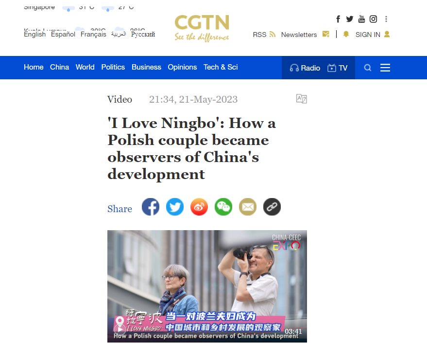 报道和视频链接:https://news.cgtn.com/news/2023-05-21/How-a-Polish-couple-became-observers-of-China-s-development-1jZBuQULo0o/index.html