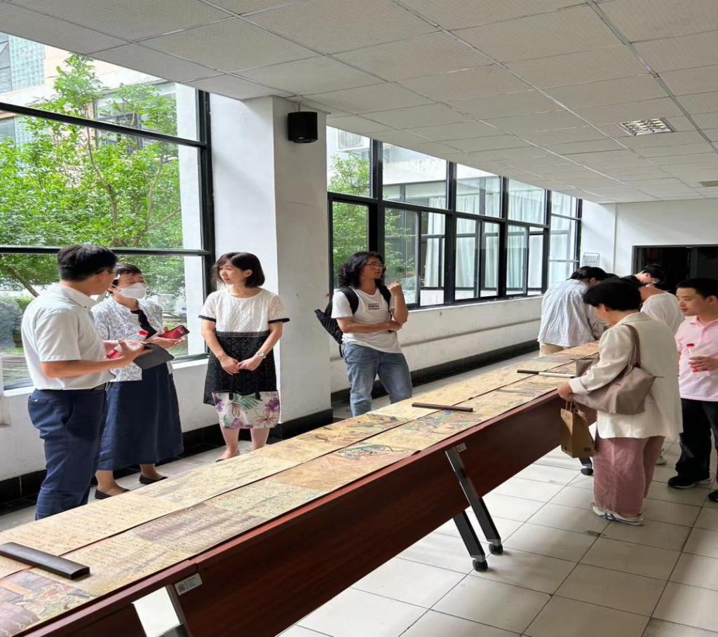张教授向师生们介绍了《源氏物语绘卷》作为大和绘的代表,在将唐绘风格贯通纯熟的基础上,注入日本特有元素,可以说是完成了展现日本本民族审美意趣和情感体验的突破。张教授还直接向参与讲座的师生们展示了自己收藏的《源氏物语绘卷》。讲座结束后,师生们在近距离观摩张教授的《源氏物语绘卷》时与张教授进行了深入的讨论,通过绘卷,共同探讨了日本的古典文学和传统文化。