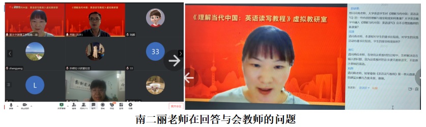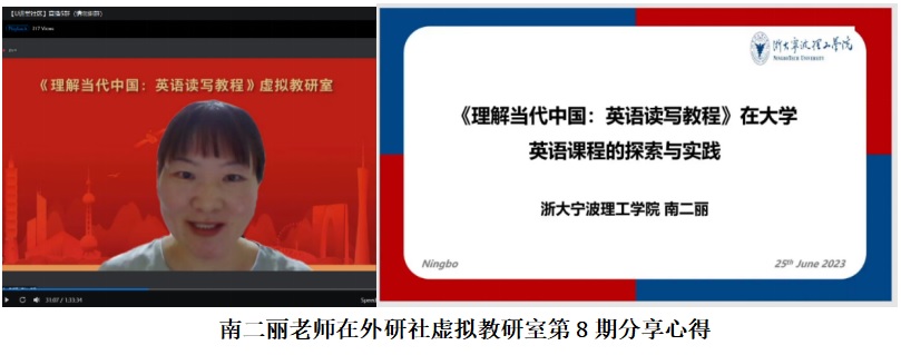 2023年6月25日晚,云顶7610线路检测“理解当代中国”团队受邀参加外研社《理解当代中国:英语读写教程》虚拟教研室第8期的教学经验分享活动,南二丽老师在活动中发言。同被邀请的主讲教师还有西北师范大学任教英语专业课程的韩文菊老师。会议由北京外国语大学英语公司的齐浩老师主持。