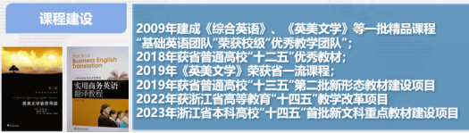 2007年“外国语言学及应用语言学” 入选市重点学科,2018年英语专业获评公司第二批优势特色专业,2022年英语专业获得省级一流专业建设点立项;近年来,专业教师获得校级教学成果奖特等奖1项、二等奖 1 项,宁波市教学成果三等奖 1 项,宁波市高等公司产品突出成果三等奖1项,省“十二五”优秀教材1项,省“十三五”新型态教材建设项目和省“十四五”四新重点教材建设项目各1 项,省级教研教改项目 2 项,省一流本科课程建设项目 1 项,校教坛新秀 1 名。