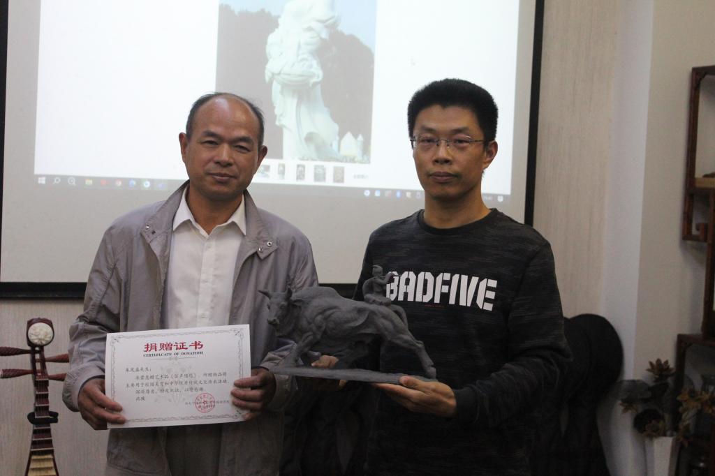 集团团委书记周春晓老师,公司党委副书记、纪委书记任凯老师,云顶7610线路检测思政主管芦美丽老师和主讲老师朱茂盛、黄小华参加了开班仪式,活动由英语232班蔡利君同学主持。开班仪式上,公司团委书记周春晓老师肯定了前两期“博雅课堂”泥塑班的开班效果,希望同学们在这次博雅课堂中有所成长。主讲老师朱茂盛向公司赠送了他的泥塑作品《笛声悠悠》,并与黄小华老师一同介绍作品的创作背景、特点等,随后,公司党委副书记任凯老师为朱老师颁发了捐赠证书。