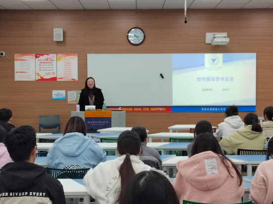 魏老师首先介绍了自己的学术经历,用自己的亲身体验启发同学们要坚定自己的求学之志,在任何情况下都勇往直前,永葆初心。在讲解如何撰写学术论文时,魏老师以自己和他人的论文例子生动地呈现了如何撰写论文引言、主体段落、总结以及论文摘要等内容,她鼓励同学们先大量阅读文献找到自己的兴趣所在,同时运用批判性思维发现研究空缺,再明确研究方向,同时建议同学们可以选择“查漏补缺,另起炉灶”这一相对简单的方法来开启学术之路。
