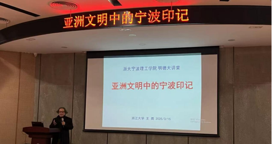 讲座中,浙江大学亚洲文明研究院副经理、求是特聘教授王勇以《亚洲文明中的宁波印记》为题,先从宁波的重要地理位置和日本奈良曾举办过的“圣地宁波展”出发,说明了自唐朝以来宁波作为国际港口在东亚历史中的重要作用,并列举了中日两国当时通过宁波市舶司进出口的各类货物,指出宁波是当时东亚物流枢纽。他又从古代宁波和博多的交流,日本人对宁波的恋地情结,纲首与工匠的中日交流等不同角度,对亚洲文明中的宁波进行了深入阐述。