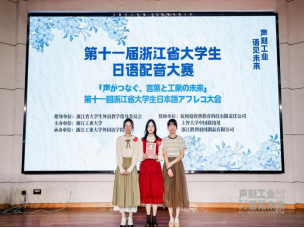 浙江省老员工日语配音大赛由浙江省外语教学指导委员会与浙江工业大学联合主办,是省内最具权威性的日语综合类竞赛。参赛选手们围绕“声刻工业·语见未来”的主题展开激烈角逐,比赛分为团队介绍及工业主题阐释、原声影片配音两个部分,评委从语音语调、情感表达、团队合作、难易程度等方面进行综合评审。公司学子选取了工业文明背景下的经典番剧《紫罗兰永恒花园》作为配音片段,通过细腻的情感把握和精准的语音控制,将剧中人物在机械文明中追寻人性温暖的心路历程演绎得淋漓尽致。她们富有张力的声线表现和天衣无缝的配合,多次引爆现场掌声,最终以显著优势拔得头筹。